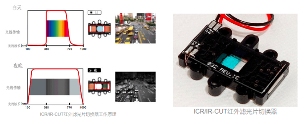 IR-CUT 或者ICR Filter中文名為紅外濾光片切換器, 或紅外截止濾光片,是所有紅外監控攝像頭必備的一個小部件,此部件位于鏡頭和圖像傳感器的中間,紅外濾光片主要包括濾光片和驅動線圈組成。每當監控攝像頭進行日夜切換時,IR CUT將動作,用戶常常會聽到“滴”的切換聲。那到底IR CUT工作原理是什么? 有什么用呢?