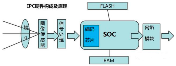 第三代數字視頻監控主要系統構成設備:網絡攝像機(IPC)、視頻編碼器(DVS)、網絡錄像機(NVR)液晶監視器、智能分析單元、CMS服務器、解碼服務器IPC硬件構成及原理圖像信號經過鏡頭輸入后,由圖像傳感器轉化為電信號,模/數轉換器將模擬信號轉換為數字信號,再經過編碼器按一定的編碼標準進行編碼壓縮,在控制器的控制下,由網絡服務模塊按一定的網絡協議發送到網絡上,控制器還可以接收報警信號及發送控制信號。
