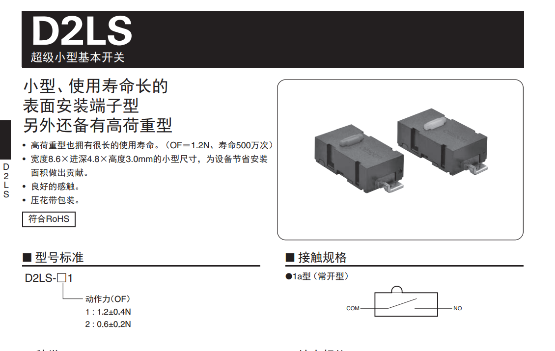 在智能插座中會有用到歐姆龍的微動開關和繼電器,今天我們來說說開關插座中最常用的歐姆龍產品系列,D2LS和SS系列,如下圖