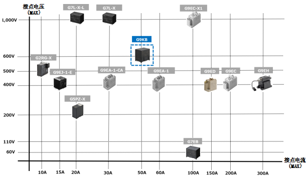 下面是歐姆龍直流高容量繼電器產品陣容圖(藍框為本次發售的G9KB