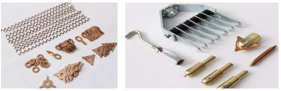 工作原理:利用低電壓、高強度的電流流過兩塊鋼板(或鋼板與介子)時產生的高電阻熱熔化接觸部分的金屬,用焊槍電極擠壓力把它們熔合焊接在一起,再用拉拔工具如慣性錘,實現修復板件缺陷的目的。附圖工具:圖1介子墊圈  2:碳棒 銅頭